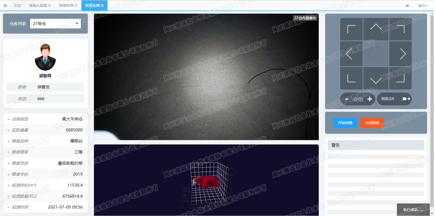 數(shù)量檢測系統(tǒng)利用高清視頻監(jiān)控攝像頭作為基礎(chǔ),利用非接觸式光電測控技術(shù),能夠及時、準(zhǔn)確的測量糧面平整狀態(tài)的倉房當(dāng)前糧食的庫存數(shù)量,測量結(jié)果可供用戶及時查看,對糧食數(shù)量和安全進(jìn)行定性層面的監(jiān)管。該系統(tǒng)可和庫區(qū)安防視頻監(jiān)控系統(tǒng)一起規(guī)劃并建設(shè),智慧糧食系統(tǒng)對接后,即可在系統(tǒng)上進(jìn)行遠(yuǎn)程實時查看。